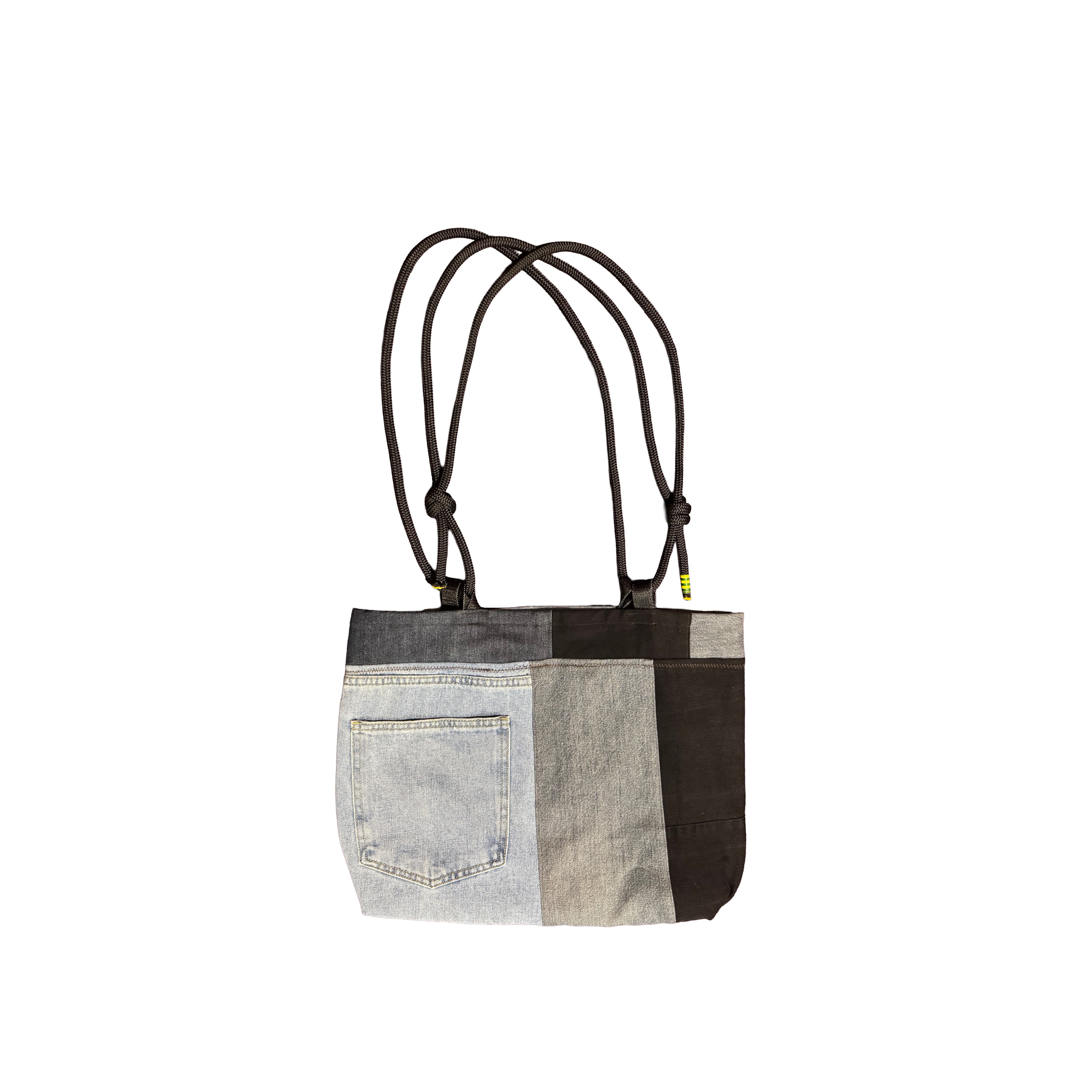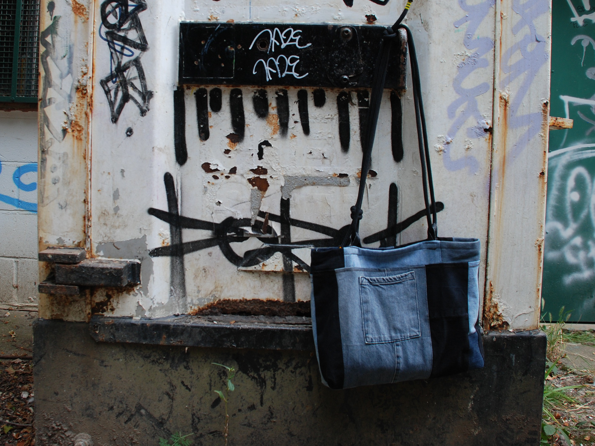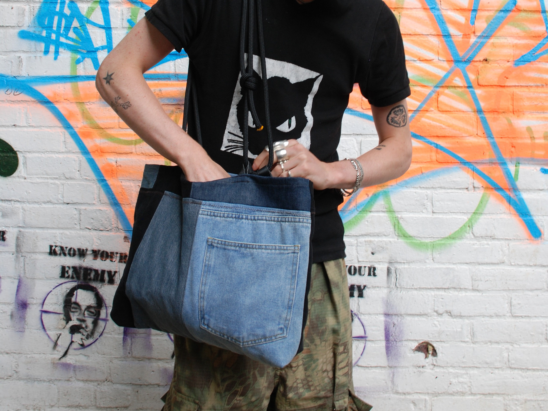Intercepting used denim jeans and climbing ropes on their way to landfill and patchworking them into usable and fashionable material for bags.