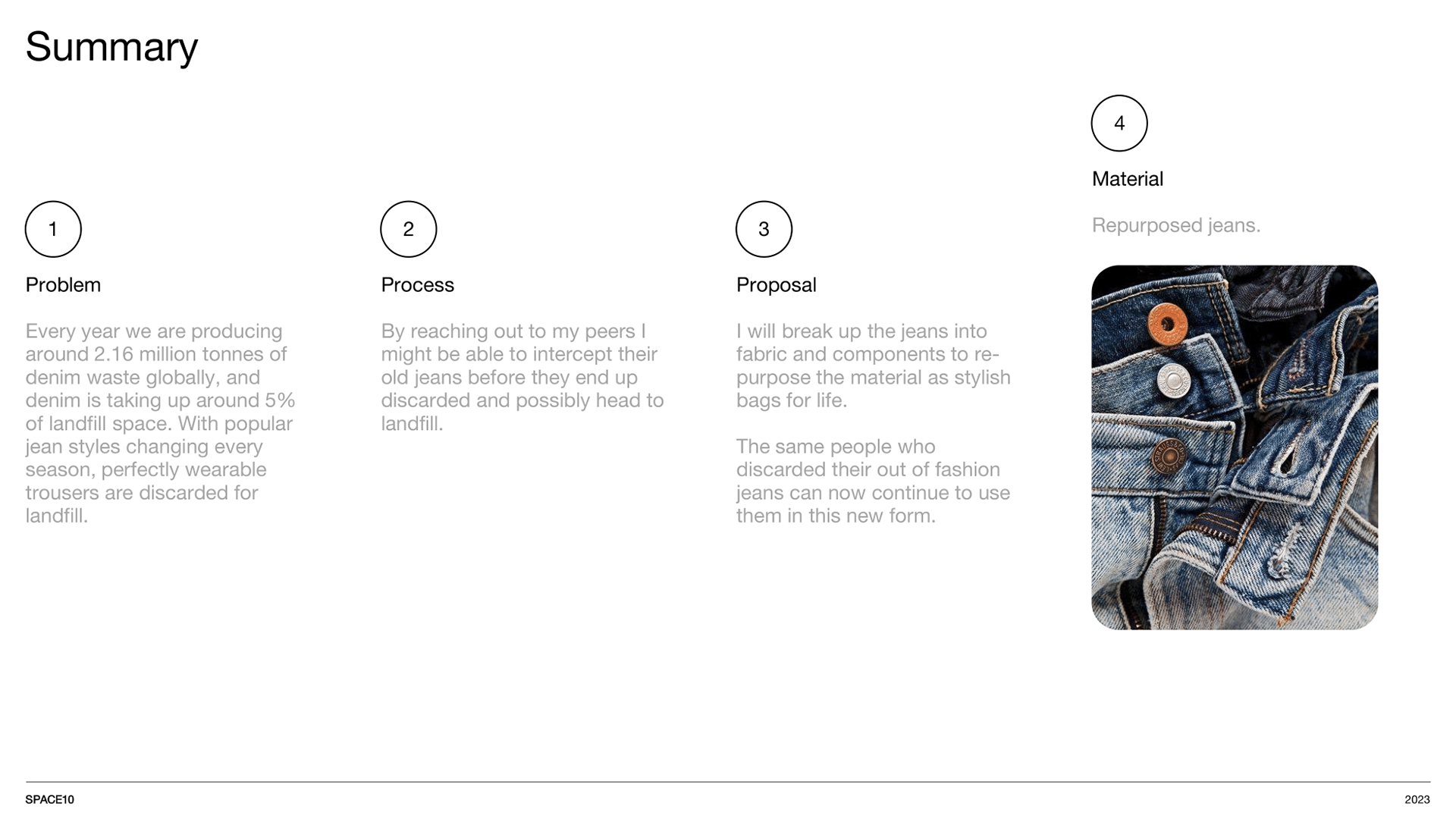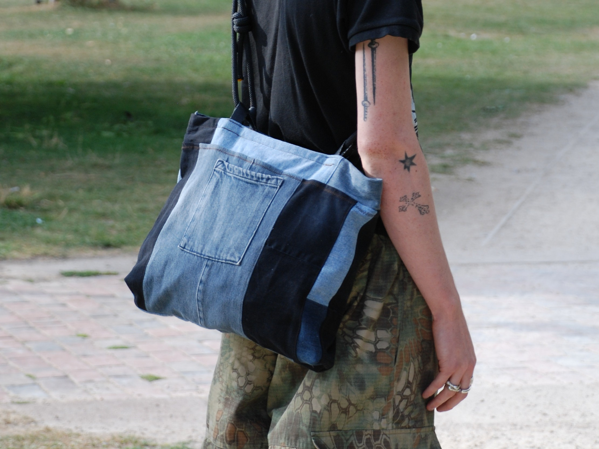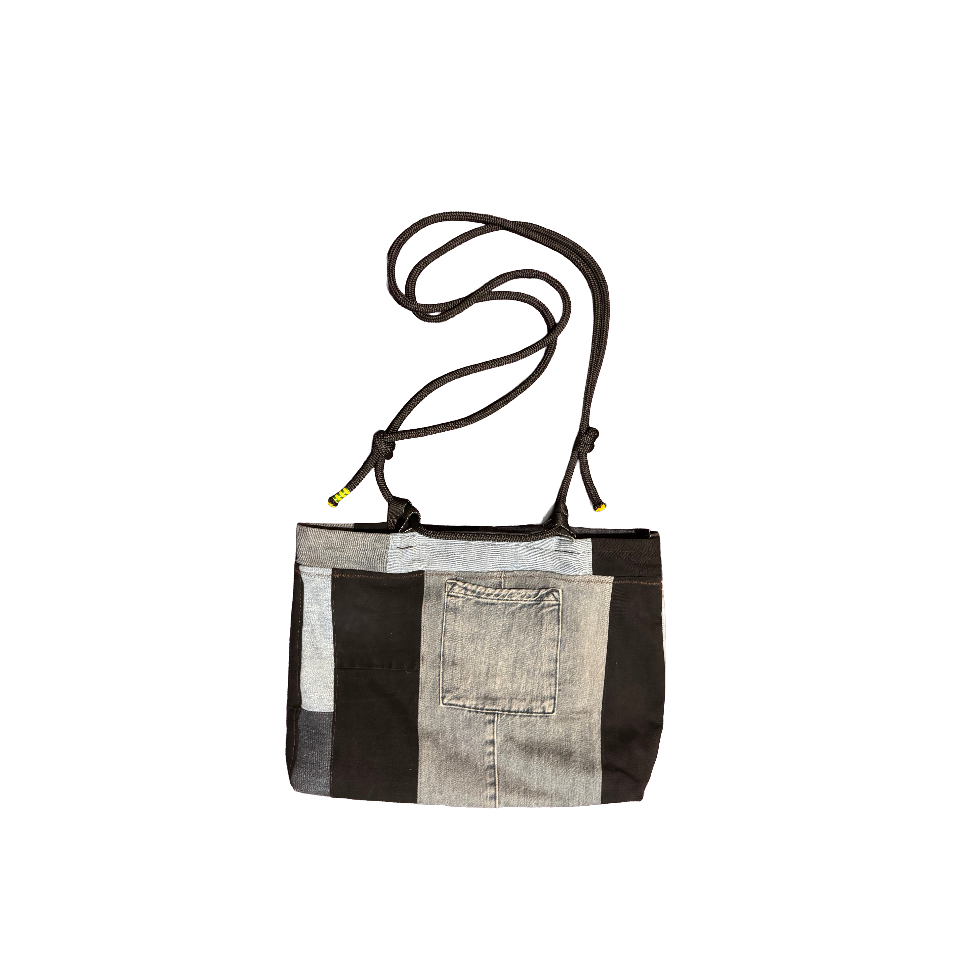 Intercepting used denim jeans and climbing ropes on their way to landfill and patchworking them into usable and fashionable material for bags.
